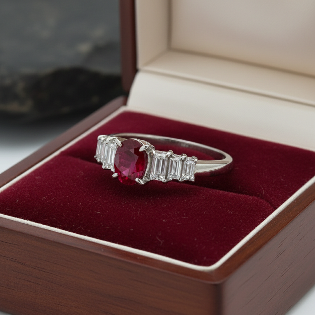 This expert-crafted platinum ring features a striking 1.03-carat oval ruby centerpiece, accentuated by six baguette-cut diamonds totaling 0.15 carats. The diamonds are carefully selected for their G-I color and VS1-VS2 clarity, enhancing the vivid ruby’s brilliance. Weighing 4.18 grams and sized at 7.25, this estate piece combines timeless elegance with exceptional craftsmanship, making it a distinguished addition to any fine jewelry collection.