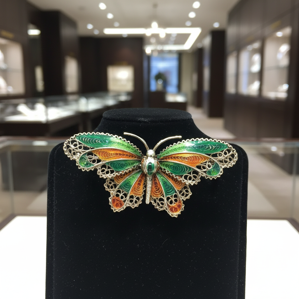 This exquisite brooch showcases a delicate butterfly crafted in 14K yellow gold, weighing 8.8 grams. Dating from the modern 1960s estate collection, it features a striking plique-à-jour enamel in vibrant green and orange hues that highlight the intricate design. Measuring 50 by 20 mm, this piece combines artistry with timeless elegance, making it a distinguished accessory for collectors and connoisseurs of vintage jewelry.