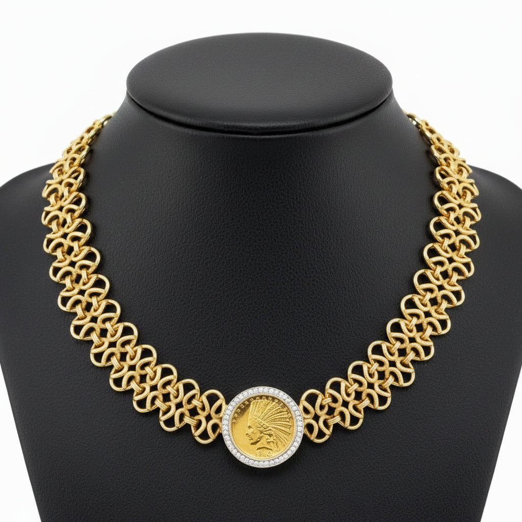 This exquisite necklace merges numismatic heritage with fine jewelry craftsmanship. The centerpiece features an authentic 1910 ten dollar coin, a coveted piece of American currency history, suspended within an elegant diamond link setting. Crafted in 14K yellow and white gold, the two-tone design creates striking visual contrast while the diamond accents add refined sparkle. A sophisticated choice for collectors who appreciate both historical significance and wearable luxury.