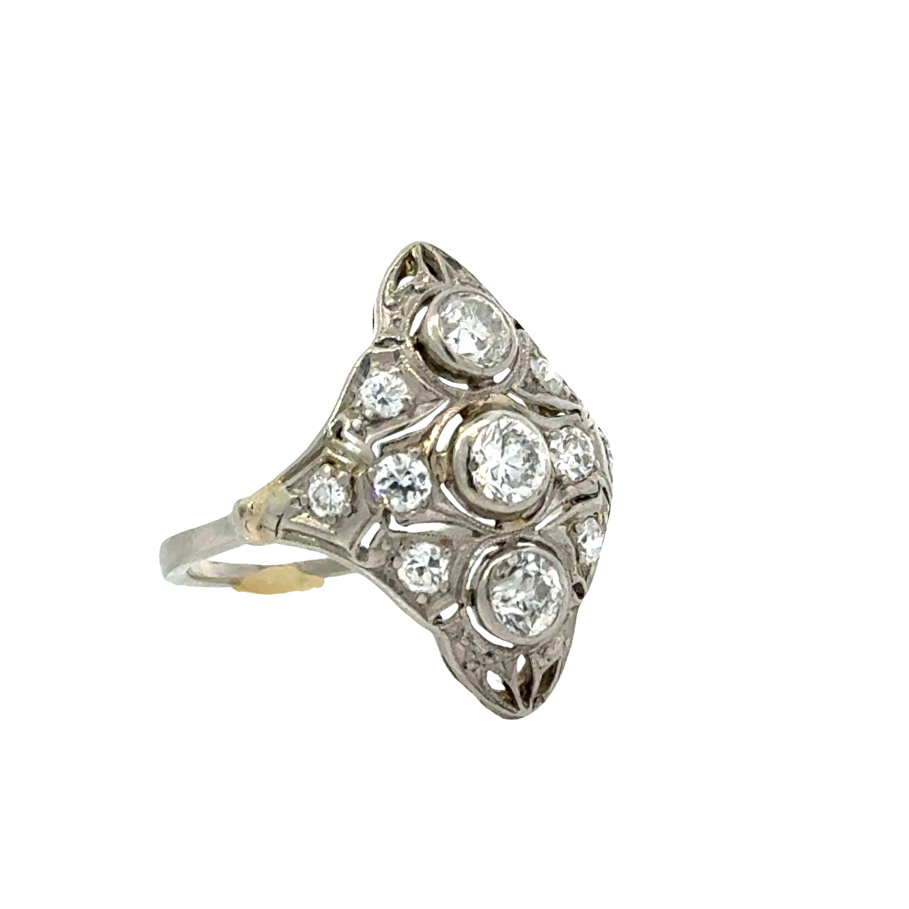 This 1920s Art Deco ring exemplifies vintage sophistication with its intricate filigree detailing across 14K white gold and platinum. Multiple diamonds catch light through the band's delicate geometric patterns, characteristic of the era's refined aesthetic. The combination of precious metals provides both visual warmth and structural integrity, while the ornamental filigree work demonstrates exceptional craftsmanship. An heirloom-quality piece that captures the glamour and precision of the Jazz Age.
