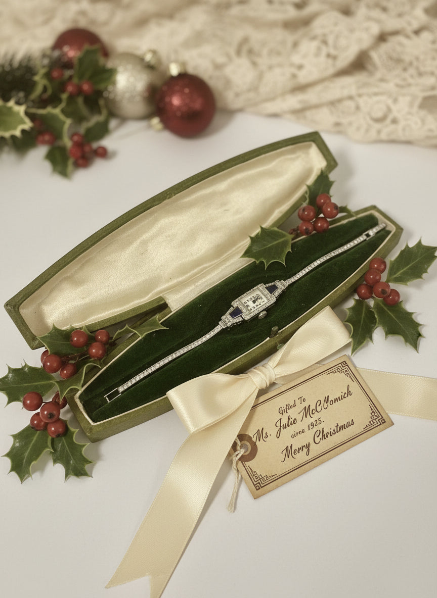 Art Deco Diamond and Burma Sapphire Platinum Watch A distinguished timepiece exemplifying early 20th-century design excellence. This platinum watch features authentic Burma sapphires and diamonds set in meticulous Art Deco styling, characteristic of the era's geometric precision and luxurious craftsmanship. The piece demonstrates the hallmarks of fine watchmaking from its period, with carefully calibrated movement and enduring construction. Ideal for collectors who appreciate historical horology and refined aesthetic sensibility. In working condition.