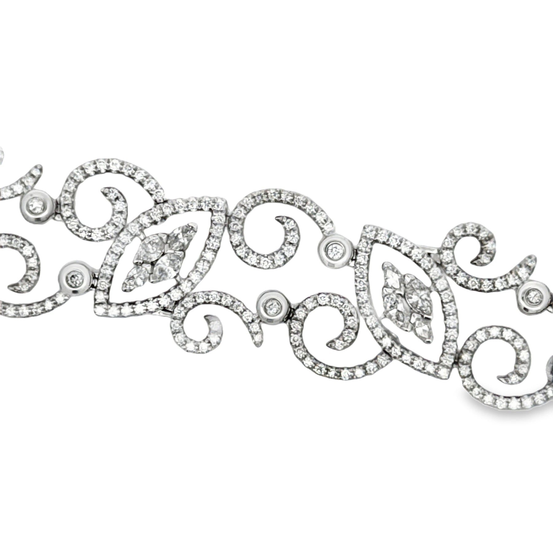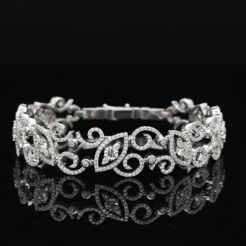 This exquisite white gold bracelet showcases 4.86 carats of meticulously selected gemstones in a sophisticated scroll design. Crafted in 14-karat white gold, the piece features fluid, organic lines that create movement and elegance on the wrist. The scroll motif—a timeless design element—allows light to dance across the surface, enhancing the brilliance of each stone. Perfect for those who appreciate refined craftsmanship and distinctive jewelry that transcends seasonal trends. An investment piece that pairs effortlessly with both everyday wear and formal occasions.