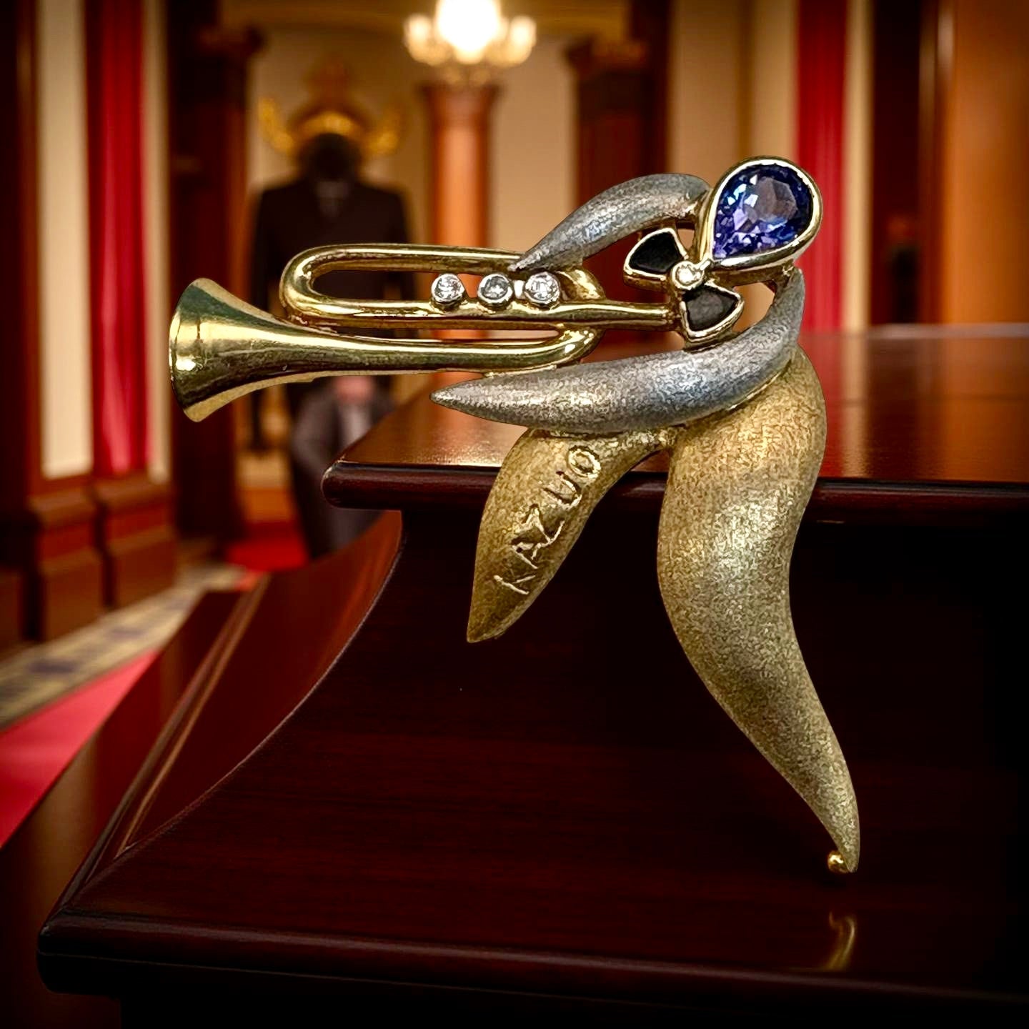 Jewelry Type : Brooch/Pendant Metal Type : Platinum/18K Yellow Gold Metal Weight : 12.94 grams Brand : Kazuo Ogana Period : Modern 1990's Measurement : 45.87x40.34mm Center Stone : Stone Type : Tanzanite Center Stone : Shape : Pear Shape Center Stone : Stone Weight : 0.33 ct Center Stone : Quantity : 1 Side Stone 1 : Stone Type : Diamond Side Stone 1 : Shape : Round Brilliant Cut Side Stone 1 : Stone Weight : 0.03 ct Side Stone 1 : Quantity : 3 Side Stone 1 : Color : G-H Side Stone 1 : Clarity : SI1 Side Stone 2 : Stone Type : Emel Side Stone 2 : Color : BLACK