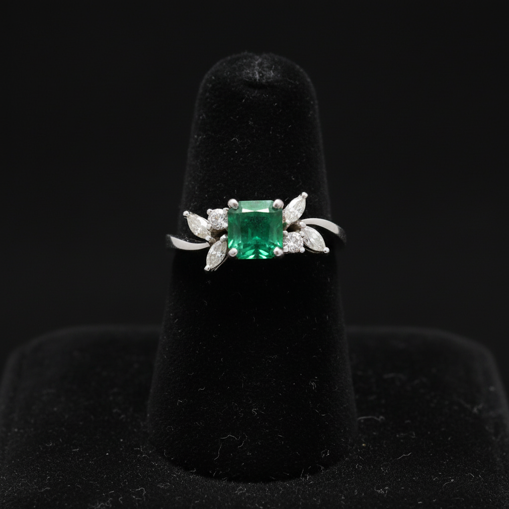Jewelry Type : Ring Metal Type : Platinum Metal Weight : 5.48 grams Ring Size : 6.75 Brand : Sena Center Stone : Stone Type : Emerald Center Stone : Shape : Princess Cut Center Stone : Stone Weight : 1.2 ct Center Stone : Quantity : 1 Side Stone 1 : Stone Type : Diamond Side Stone 1 : Shape : Mixed Cut Side Stone 1 : Stone Weight : 0.5 ct Side Stone 1 : Quantity : 6 Side Stone 1 : Color : J-L Side Stone 1 : Clarity : VS1-SI2