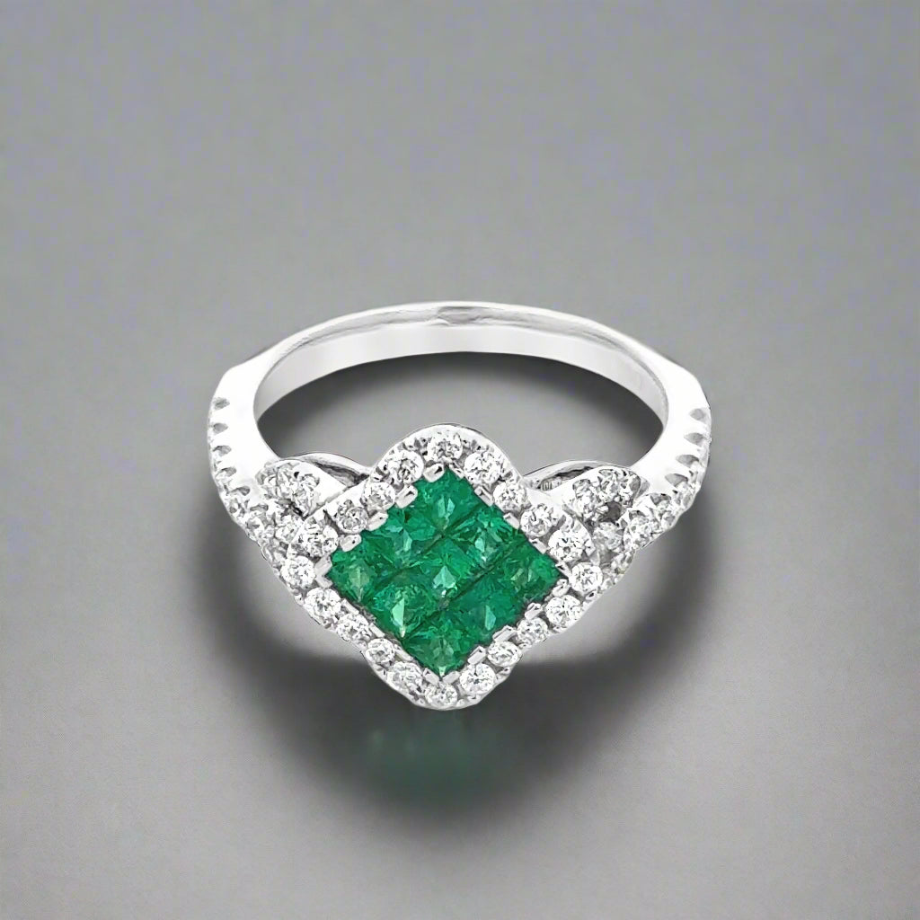 Discover the beauty of this 18K white gold cocktail ring featuring 9 dazzling princess cut emeralds and sparkling natural diamonds. The stunning design will add elegance to any outfit. Crafted with expert precision, this ring will be a timeless addition to your jewelry collection.
