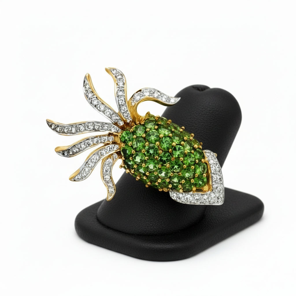 Jewelry Type : BroochMetal Type : 18K White/Yellow GoldTotal Weight : 10.20 gramsBrand : EstatePeriod : 1990'sMeasurement : 39.24 x 25.21Side Stone 1 :Stone Type : DiamondShape : Round Brilliant CutStone Weight : 0.86 ctQuantity : 73Color : G-HClarity : VS1-SISide Stone 2 :Stone Type : Tsavorite GarnetShape : RoundStone Weight : 3.42 ct